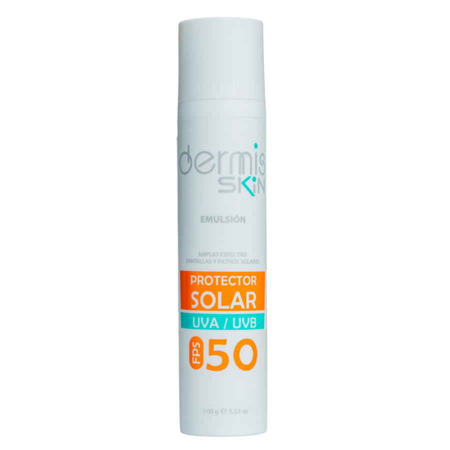 El Protector Solar Emulsión FPS 50+ Dermis Skin brinda protección de amplio espectro contra los rayos UVA y UVB, ayudando a prevenir el envejecimiento prematuro, la aparición de manchas y el daño solar causado por la exposición diaria. Su textura ligera, de rápida absorción y acabado no graso, lo hace ideal para el uso diario en todo tipo de piel, incluso piel sensible. Enriquecido con antioxidantes, fortalece la barrera cutánea y mantiene la piel hidratada, protegida y saludable.